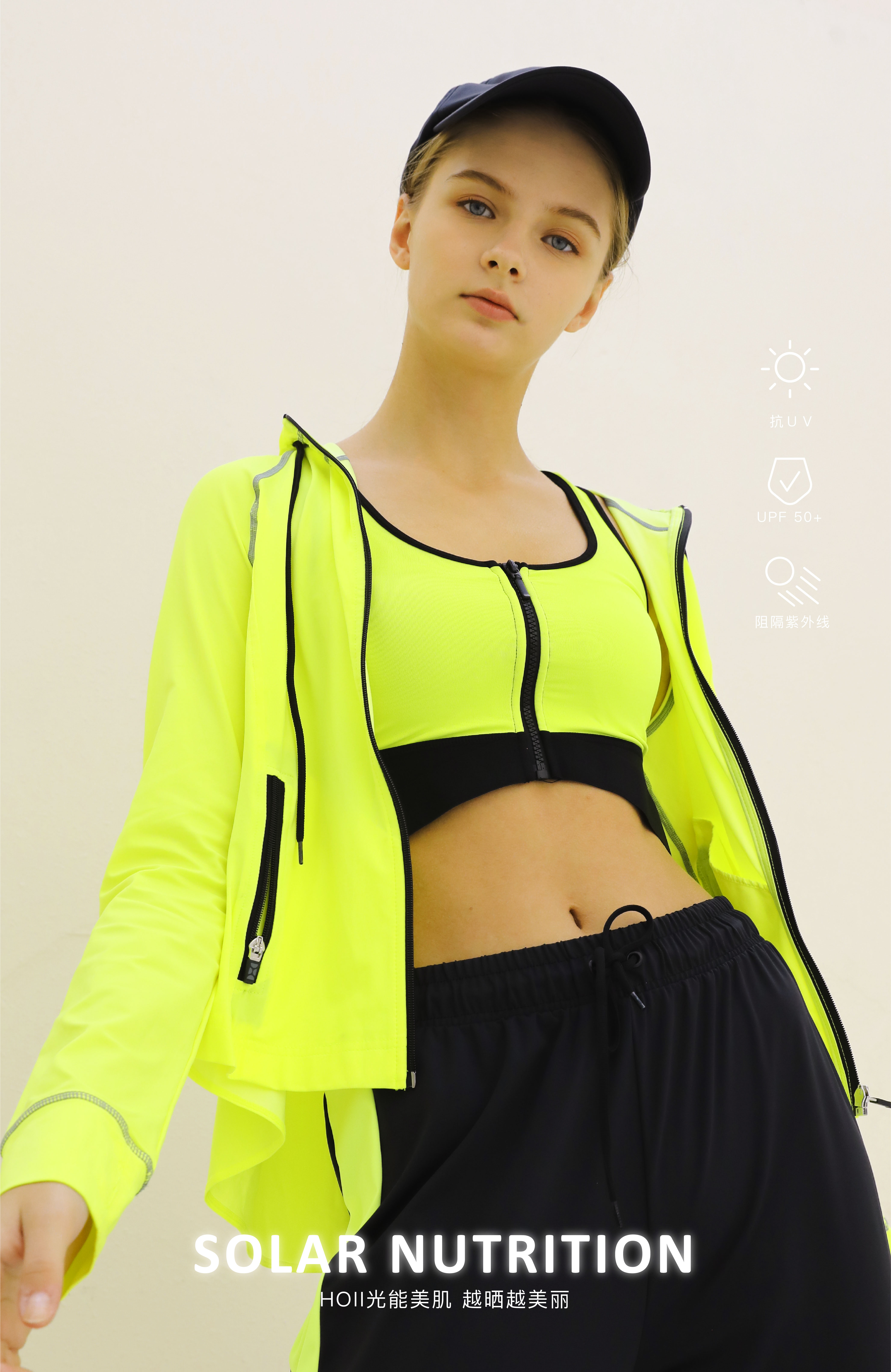 产品轻薄舒适,结合崭新的萤光环保涂料与纺织技术,除了有抗紫外线UPF50+的防晒效果外,更可将阳光转化集中为有益的可见光,依颜色不同,输出不同的波长及能量传递引导到肌肤上。