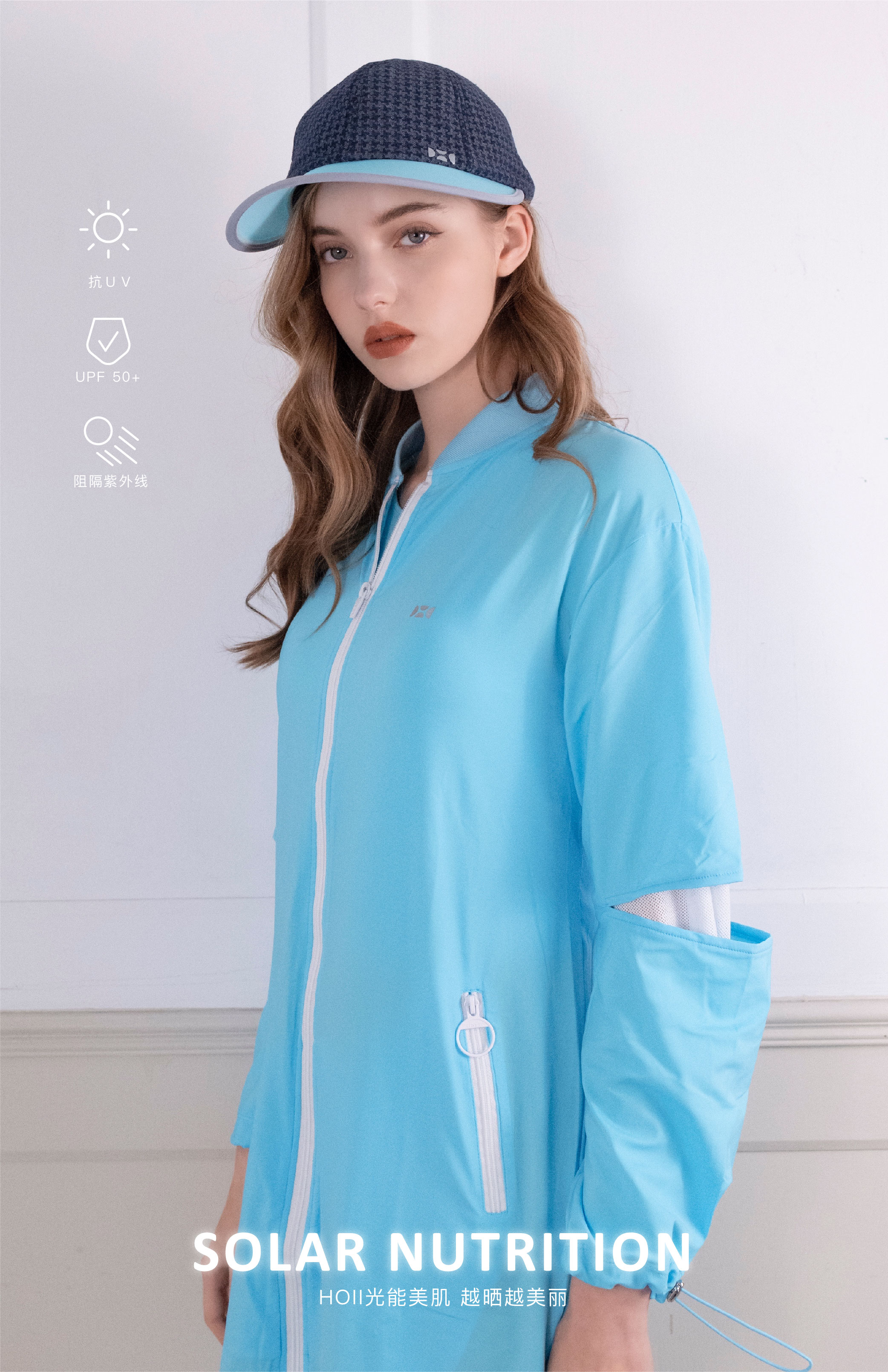 产品轻薄舒适,结合崭新的萤光环保涂料与纺织技术,除了有抗紫外线UPF50+的防晒效果外,更可将阳光转化集中为有益的可见光,依颜色不同,输出不同的波长及能量传递引导到肌肤上。