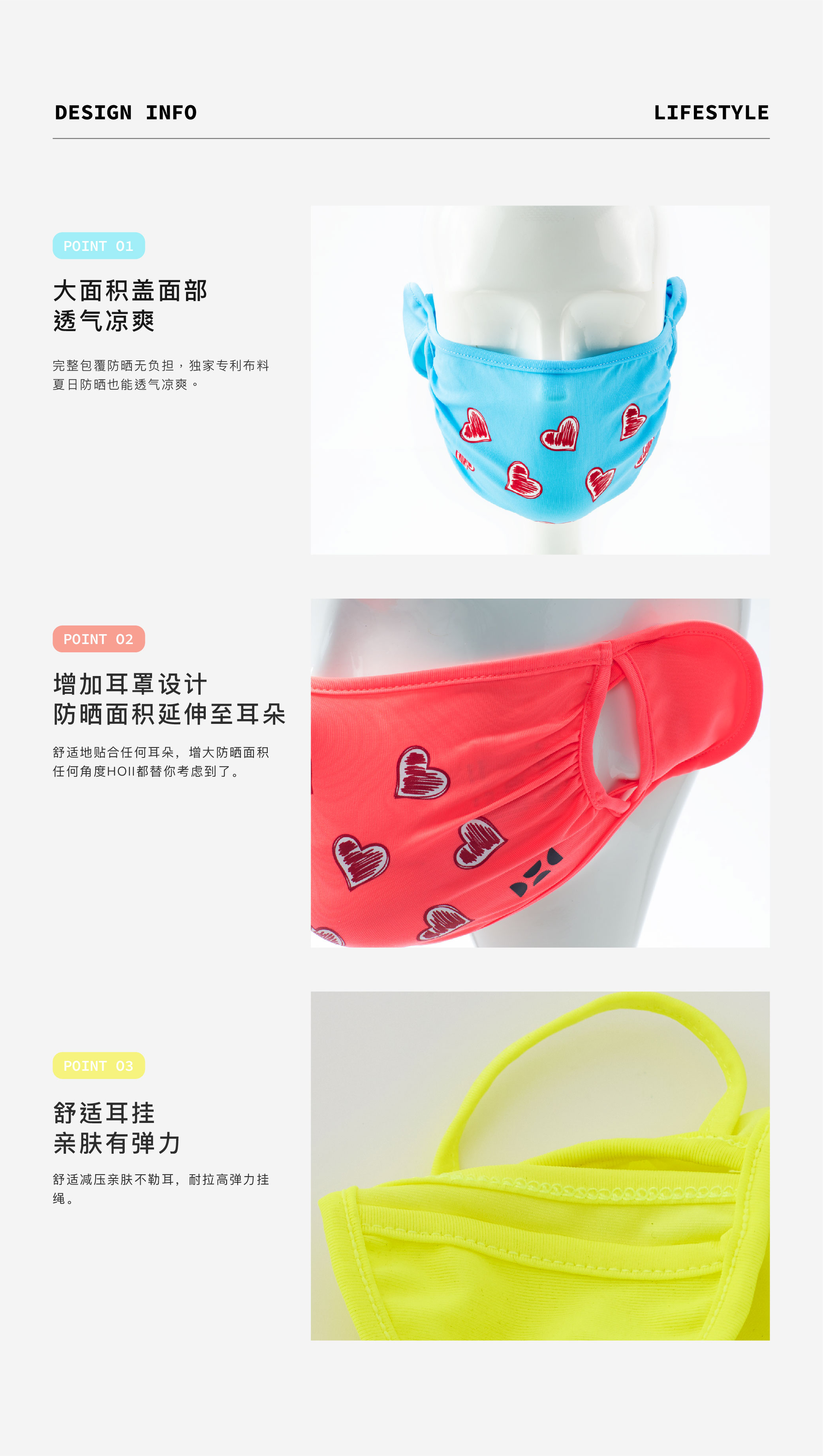 产品轻薄舒适,结合崭新的萤光环保涂料与纺织技术,除了有抗紫外线UPF50+的防晒效果外,更可将阳光转化集中为有益的可见光,依颜色不同,输出不同的波长及能量传递引导到肌肤上。