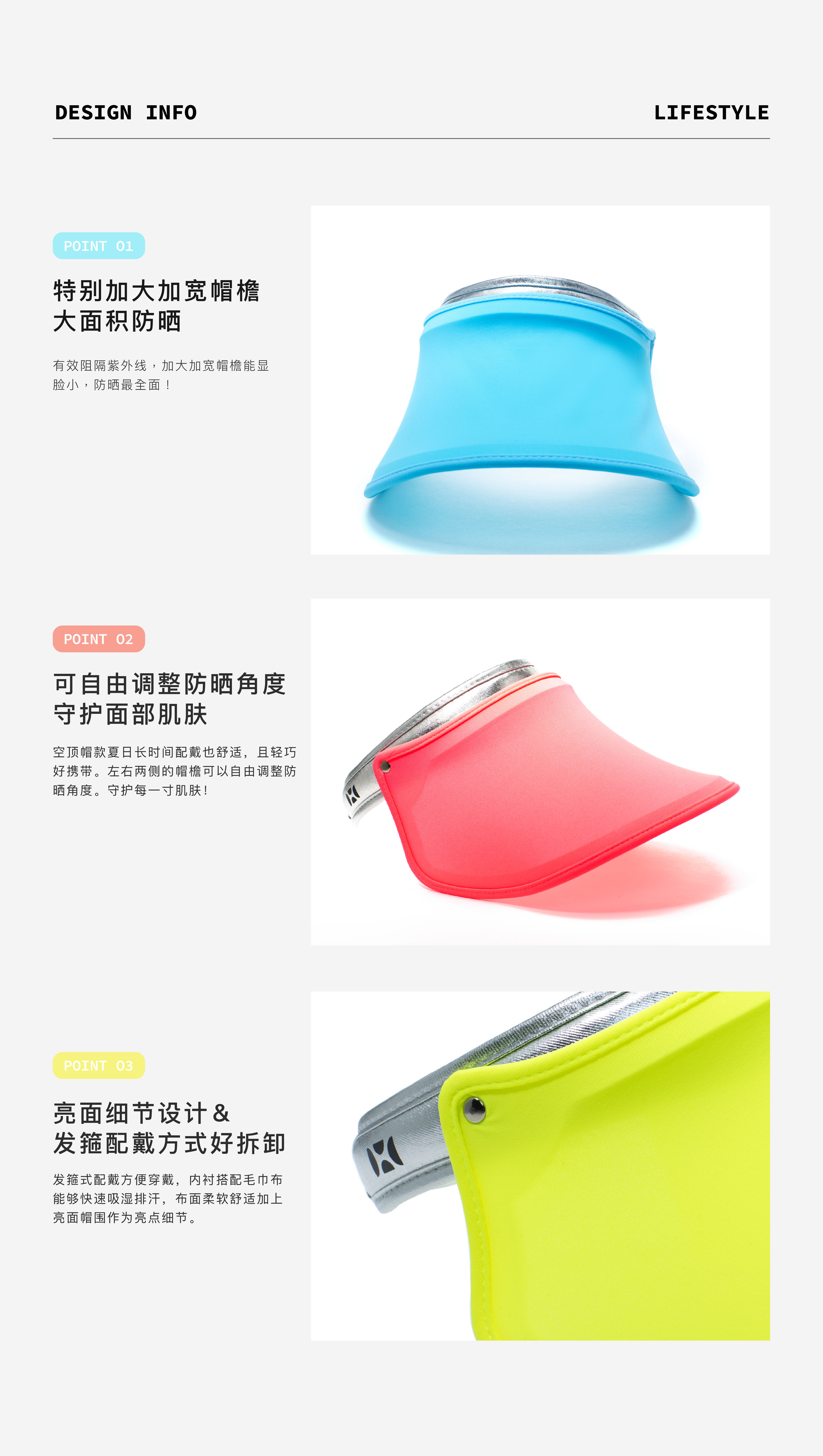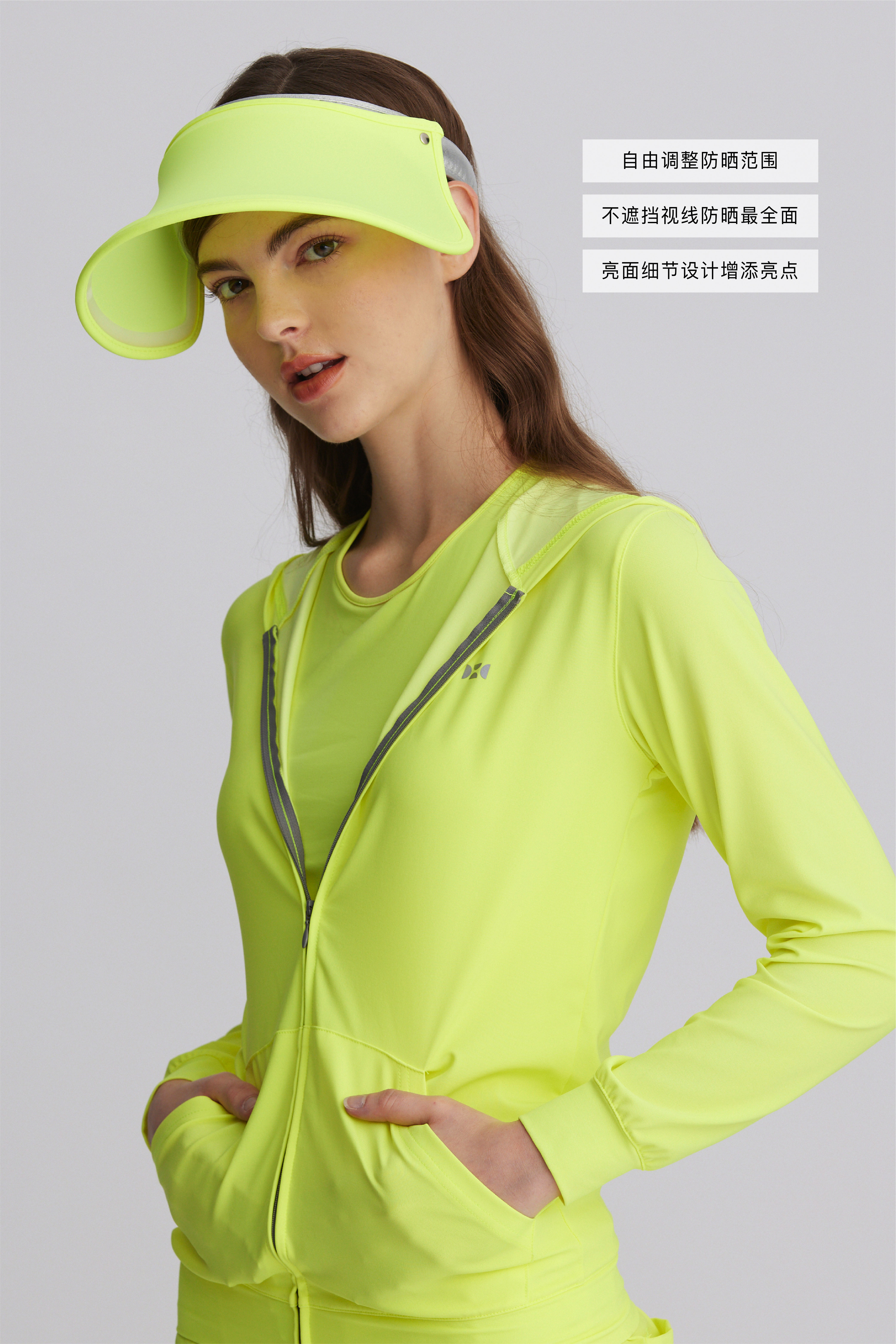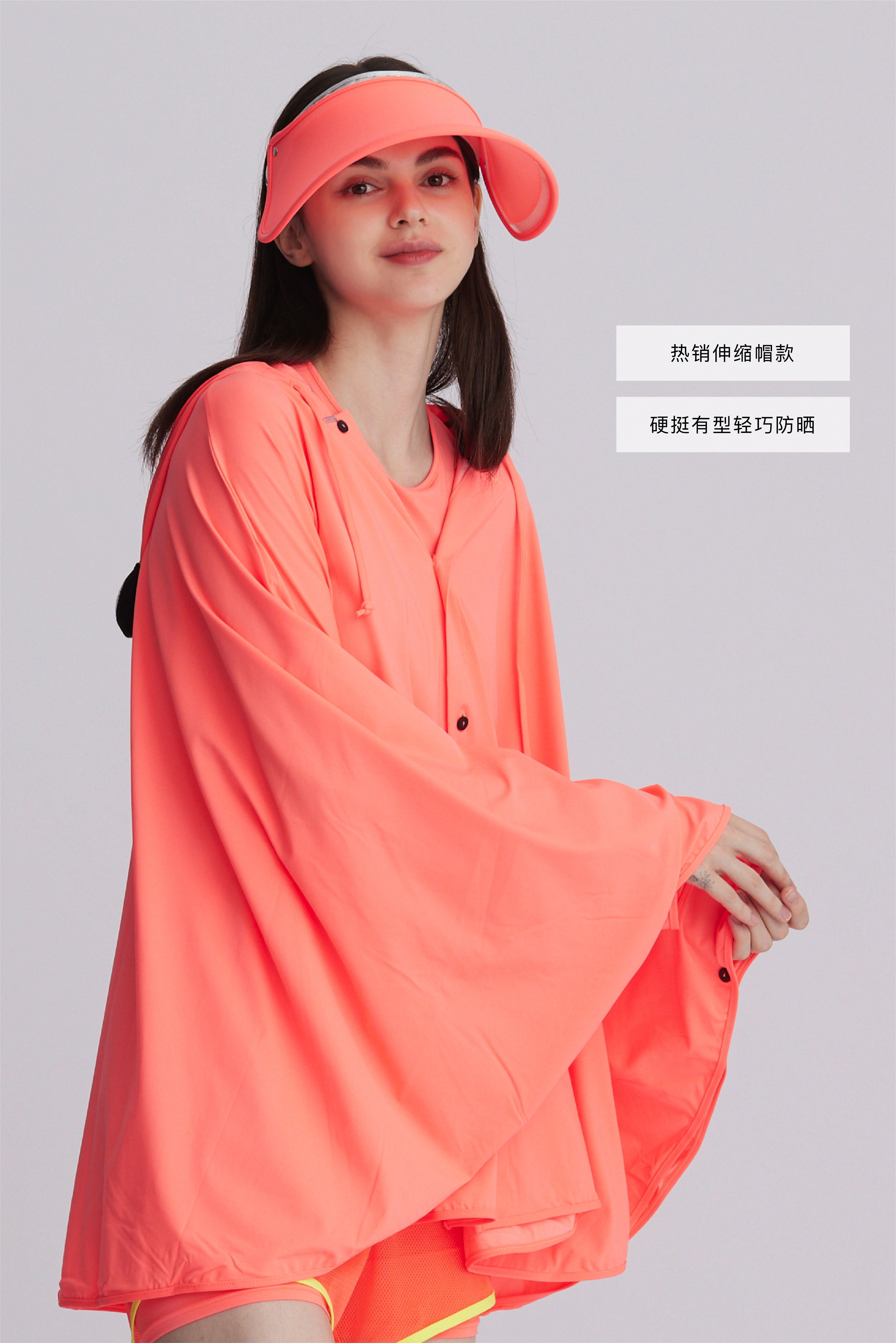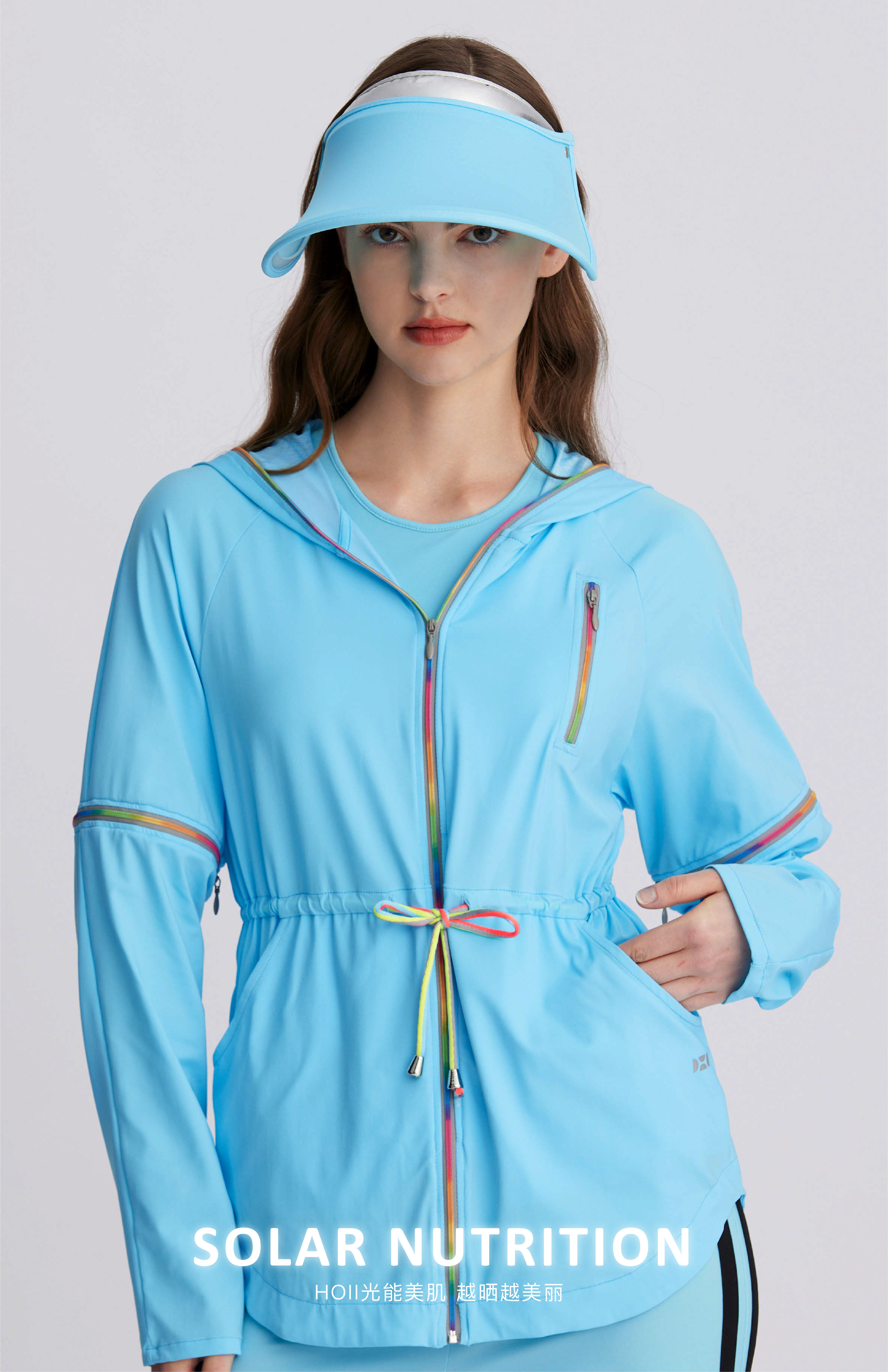 产品轻薄舒适,结合崭新的萤光环保涂料与纺织技术,除了有抗紫外线UPF50+的防晒效果外,更可将阳光转化集中为有益的可见光,依颜色不同,输出不同的波长及能量传递引导到肌肤上。