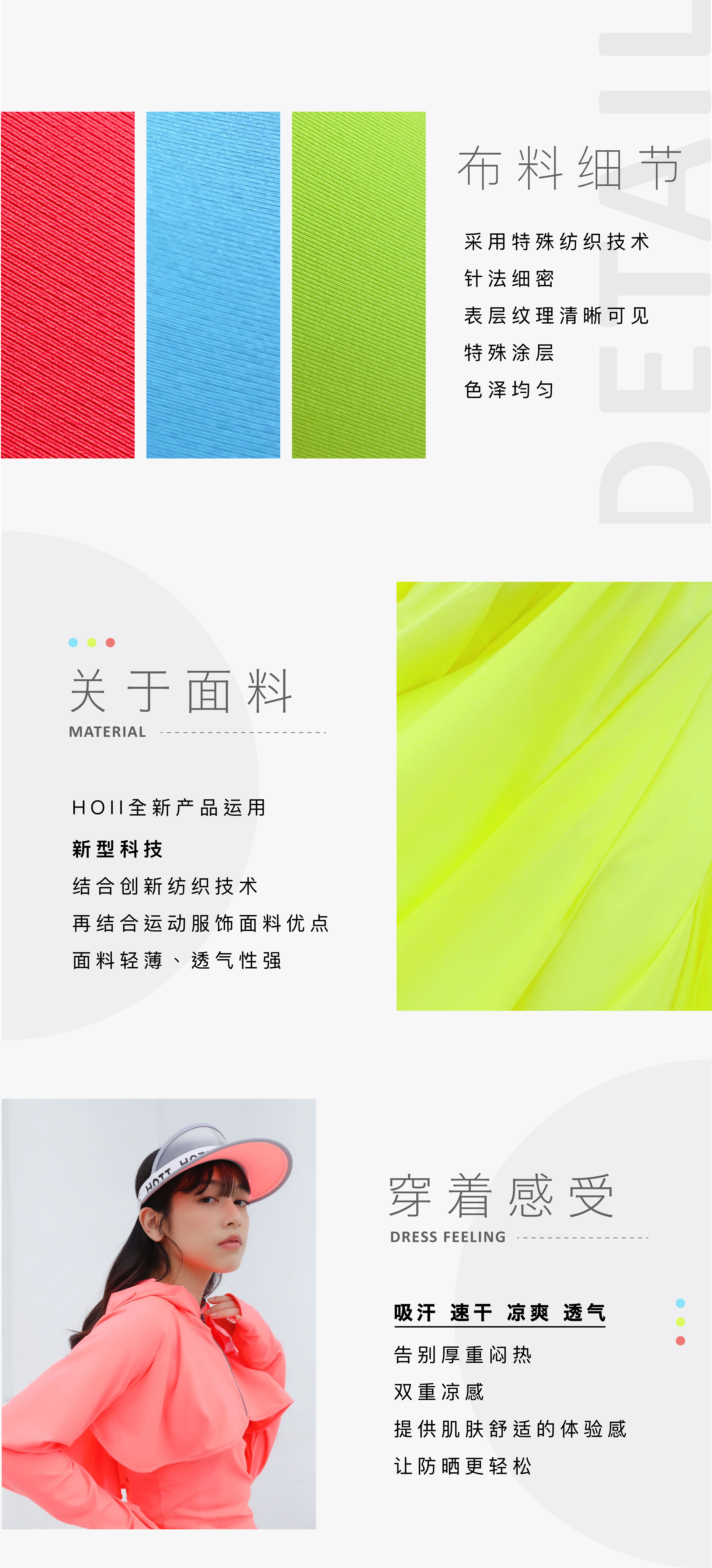 产品轻薄舒适,结合崭新的萤光环保涂料与纺织技术,除了有抗紫外线UPF50 +的防晒效果外,更可将阳光转化集中为有益的可见光,依颜色不同,输出不同的波长及能量传递引导到肌肤上。